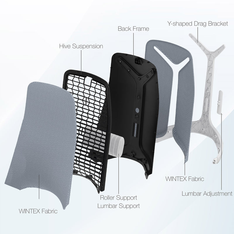 Čalounění opěradla je tvarováno do šestiúhelníkového vzoru, který vytváří pevnou a prodyšnou strukturu typu včelí plástve, umožňující cirkulaci vzduchu a udržení optimální teploty mezi tělem a materiálem během dlouhého sezení. Ventilační otvory urychlují odvádění tepla a zlepšují prodyšnost zadní části. Pro snížení zátěže v oblasti zad je uvnitř židle integrována také opora ve tvaru včelí plástve, která neomezuje proudění vzduchu a přizpůsobuje se pohybům uživatele – tím účinně snižuje tlak na záda při změnách polohy.