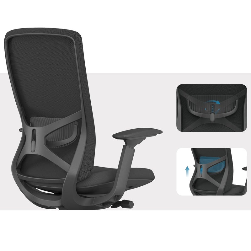 Opěrka zad je vyrobena z odolné a extra pevné síťoviny, která zajišťuje optimální proudění vzduchu a tím i větší komfort při dlouhodobém sezení. Ergonomická kancelářská židle je vybavena funkcí výškového nastavení bederní opěrky, která se tak snadno přizpůsobí anatomickému tvaru zad uživatele. Výjimečnost této bederní opory spočívá v možnosti nastavení její hloubky – díky tomu si můžete upravit míru podpory přesně podle svých potřeb a preferencí.